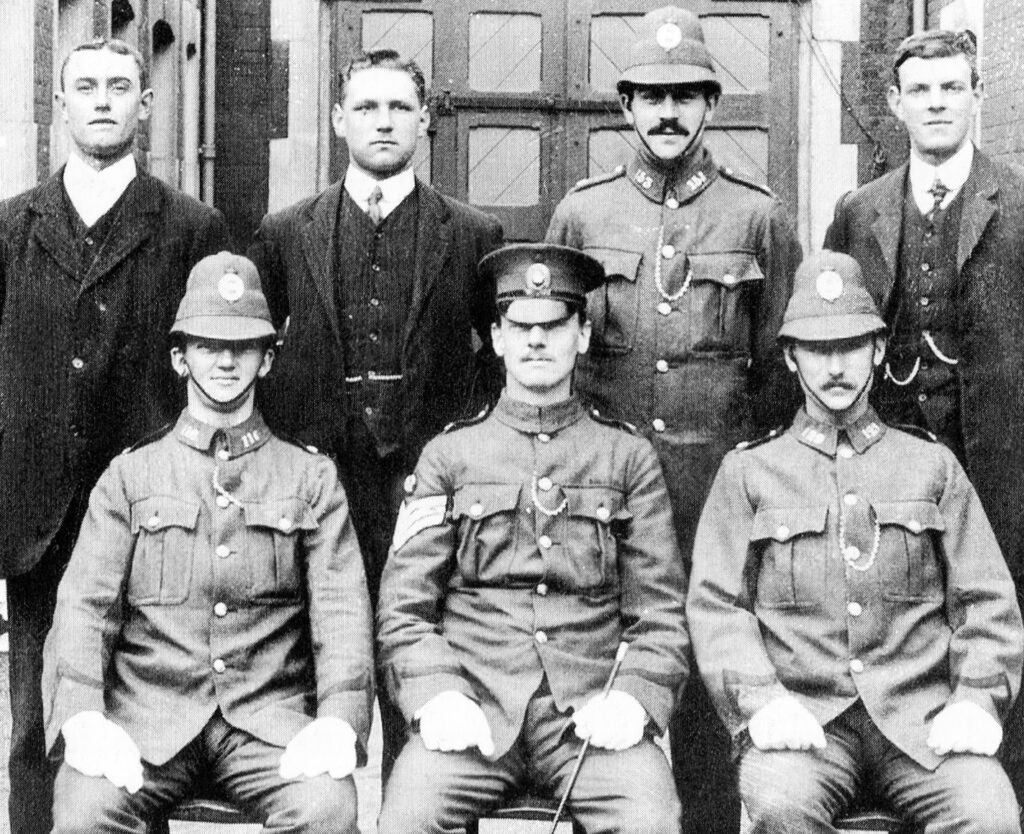 It is the days of black and white photography, and a time when in the summer, Dorset Police officers wore grey uniforms, mainly because of all the unmetalled dusty roads ! The grey uniform stopped in 1912. I have written a post already called ” Men in Grey” so rather than going over that, you can find that post instead ! With my knowledge and other photos it is clear to me that it was between 1908 and the WW1 but that is 6 years. Under this photograph is written: “A group of recruits with the sergeant drill instructor in 1908. Police drill instructors were loaned to the army during the First World War to teach drill.”