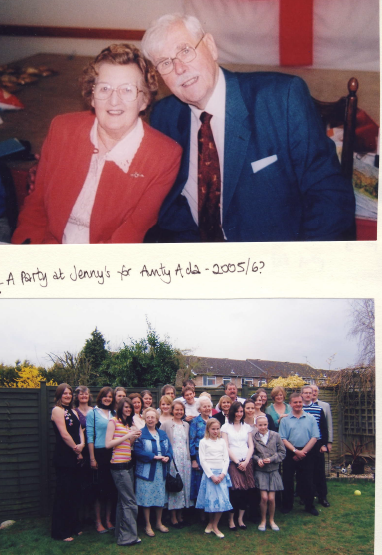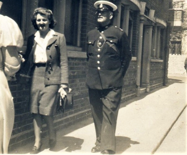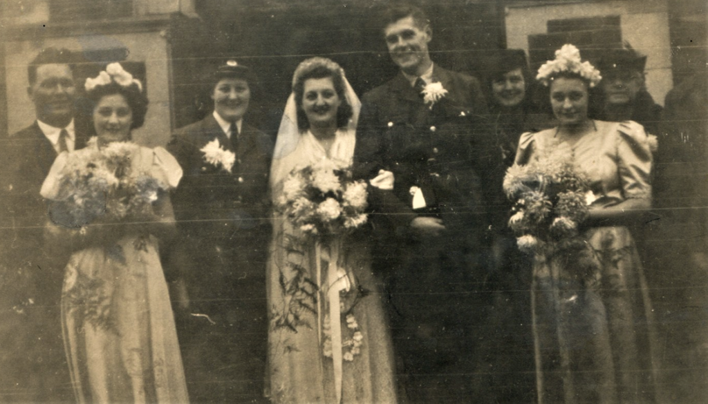 A reception was held in the bride’s home (where food aplenty was laid out on the Anderson shelter, the wedding cake being a converted Xmas cake and the majority of guests contributing to the eats). The honeymoon (one night) was spent at Weymouth, (after which the bridegroom’s parents returned). The bride travelled in a blue silk dress (this was her own and in spite of no thermal underwear was not cold) with elephant shade ‘jigger’ coat and black accessories. The bridegroom was formerly in the Dorset Constabulary (and informally in the RAF).