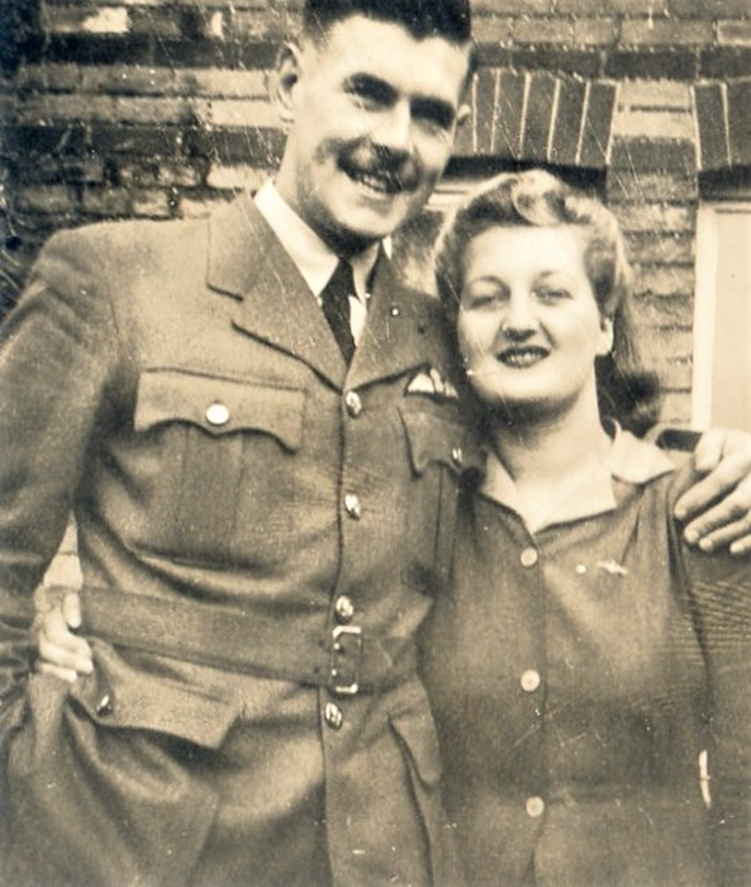 (Top) ,Outside 50 Belmont Rd. 27th December 1943, (right) Peggy and I together at Weymouth on 30th December 1943 as there was no photographer available for the wedding itself.
