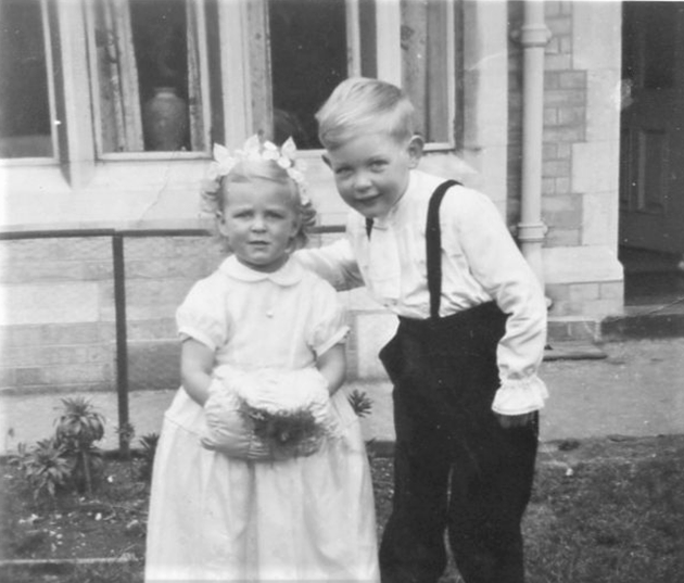 (Left), Peter in uniform of Ringwood Grammar School, Bournemouth & (right), Children’s Christmas Party at Weymouth, Peter, Peggy, Anita and I.