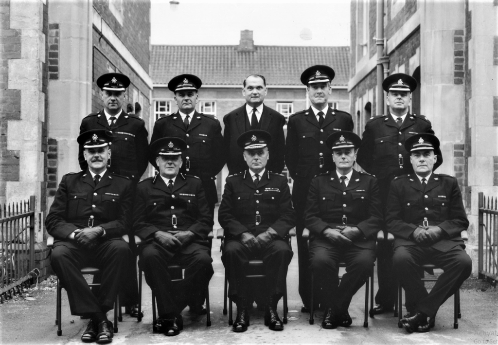 The Chief Constable, Deputy. and Superintendents at gate to HQ. Dorchester. Back row (left to right): Supt. C. Parson, Supt. W. Baigent, Det. Supt. B. Smith, Supt. E.Rushen, Supt. R. Trickey. Front row (left to right): Supt. V.T. Davis, H. Lovell, Ast. C.C., The Chief Constable A Hambleton, C.B.E., M.C., D.L., Chief Supt. J. Grey, Supt. C. Rushen.
