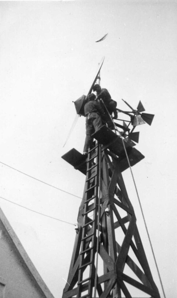 Benny Cresdie & I servicing a wind generator at Anvil Pt. Lighthouse, Swanage, 1938.