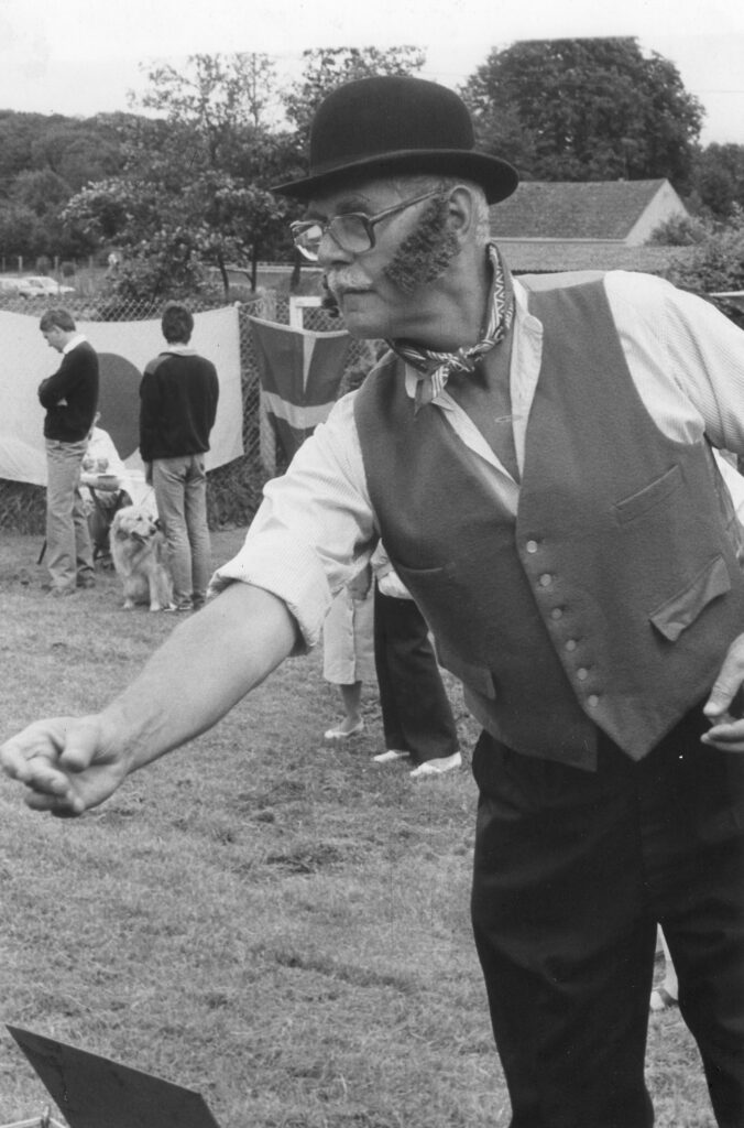 (Left), As ‘yokel’ at summer fete, Bradford Peverell & (right) As auctioneer at produce show at Bradford Peverell. Sue Brown is handing me items for sale.