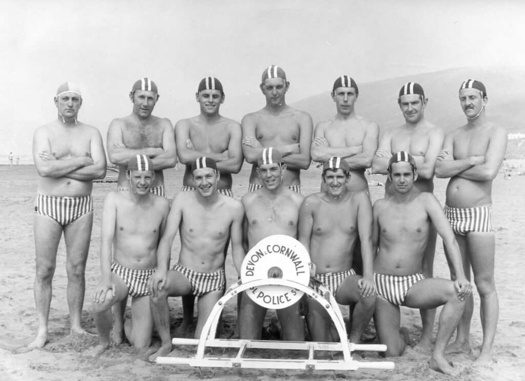 Peter, centre back row, as a member of the Devon Police Surf Life Saving Team.