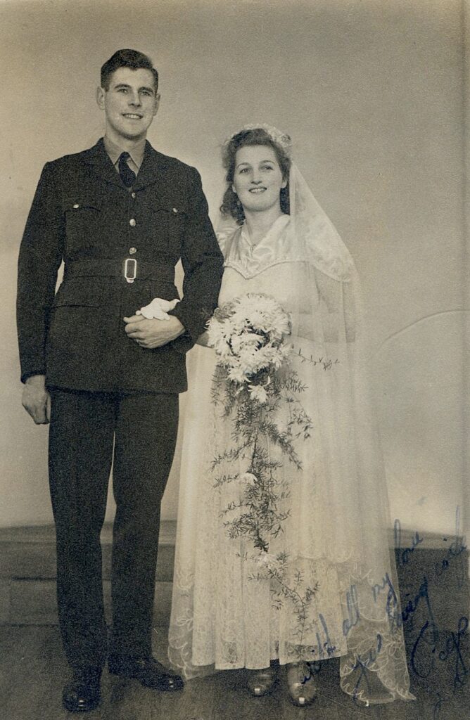 A number of chaps in my squadron were granted embarkation leave of 10 days, which meant that we should soon be on our way overseas to South Africa, Canada or the USA. Peggy and I, not knowing what the future had in store for us, decided to marry. This was one of the very best decisions we ever made. It was necessary for me to obtain a Special Licence from the Salisbury Diocese for us to marry in St. John’s Church in Ashley Road, Parkstone. I did so and it cost me 7/6 (36p) but like the engagement ring I had purchased before, it was worth every penny.