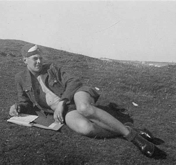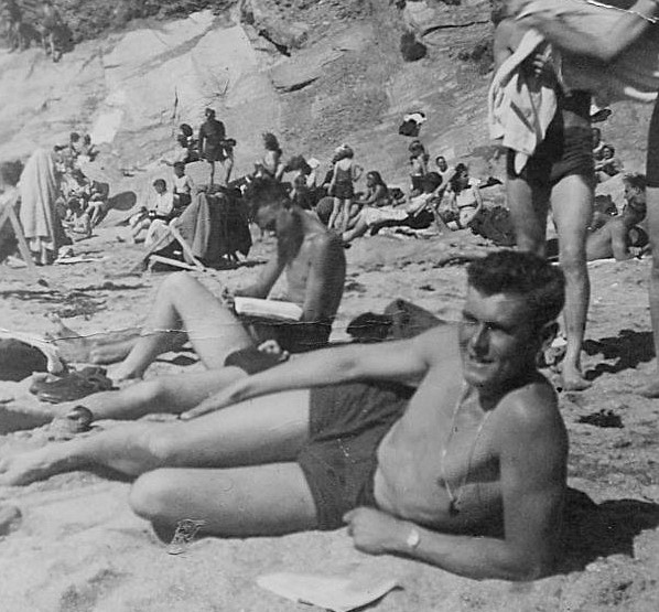 Left,) At cliff top, Newquay, studying notes & (right) on the beach at Newquay in the sunshine.