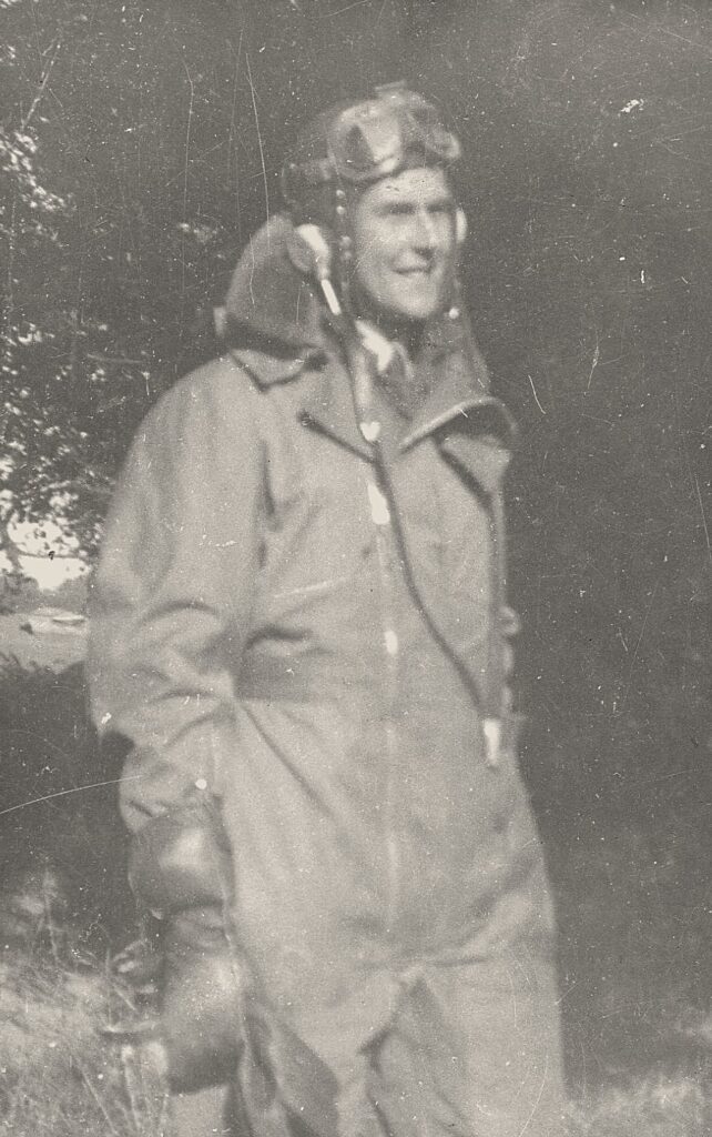 In RAF battle dress. The white flash on cap indicating aircrew in training. on the first photo and in flying kit at grading school, 1943.
