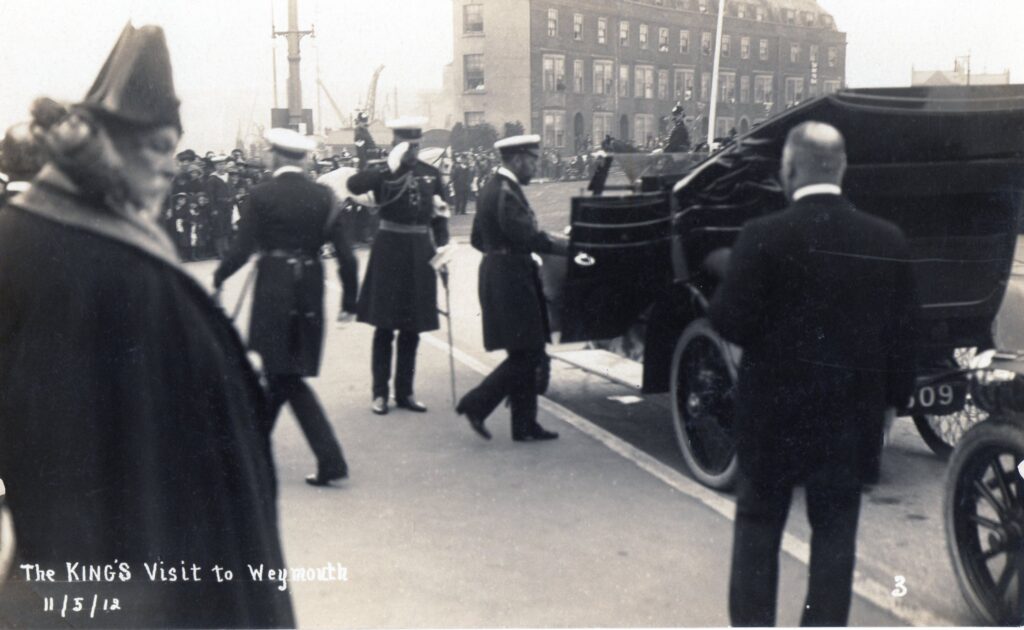 On the 5th May 1912 the local papers reported that the King would be visiting Weymouth and would come ashore from his yacht on Friday 11th after naval manoeuvres during the week out at sea. On the 8th the King and his entourage boarded a train from London to Portsmouth where they boarded the Royal yacht the “Victoria and Albert” which was 120 metres long and powered by steam engines. Due to fog the yacht was detained off the Isle of Wight on Tuesday and could not set sail till Wednesday morning passing the Needles accompanied by for other cruisers. The next three days saw interruptions to the arranged manoeuvres which were supposed to take place 15 miles off Weymouth. The fog changed the programme so firing took place out in the channel on Thursday and Friday so the Kings arrival was delayed till Saturday morning which cut short his visit. Here the King arrived at the Pier at half past nine, being met by the Mayor, Town Clerk and other local dignitaries. There was a lot of interest and there were many onlookers including about 2000 school children who sang the national anthem and the King and the Mayor then walked towards them. The King apologised to the Mayor that he would not be able to visit the local hospital as arranged as he had to stick to his timetable and he would be leaving from the train station at 1025 am.</p><p> The King then asked the Mayor to pass on his regrets to the inhabitants of Weymouth who had not managed to see as he would now have to leave. This photograph shows the King and Sir George CALLAGHAN ,Commander of the Fleet getting into a waiting motor car driven by Percy A’COURT from the Royal Hotel Mews. In the background if you look close enough you can see three policemen, one police Sgt on a white horse behind Sir George and also another officer on a black horse behind the car. These policemen maybe from the County Constabulary as there is evidence they were involved and I cannot see where the Borough Force would have kept or needed horses.