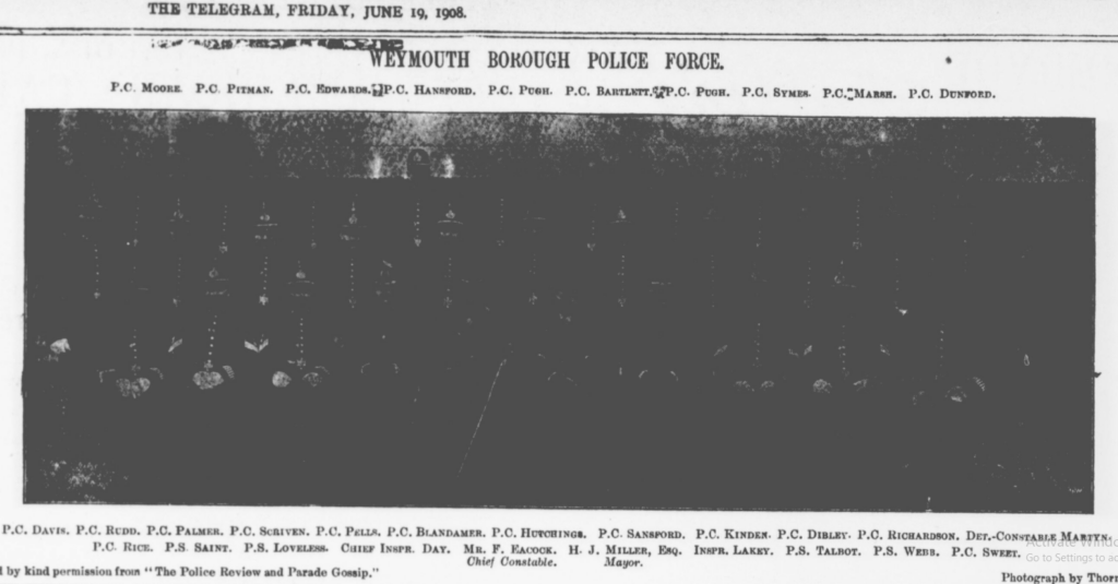In June 1903 the Dorset Constabulary Tug of war team was changed bringing back some old blood and some new recruits. The deputy chief constable was now in charge with the Sgt Major. There was also the added attraction of two brothers competing against each other as Sgt William SAINT was competing against his brother Charles a Sgt for the Borough. The borough won again quite convincingly in poor weather under Insp MORRIS. The team being: Sgt’s LOVELESS and SAINT and PC’S WEBB, MARSH, HUTCHINGS, MARTYN, PALMER, KINDEN, BARTLETT and HANSFORD.